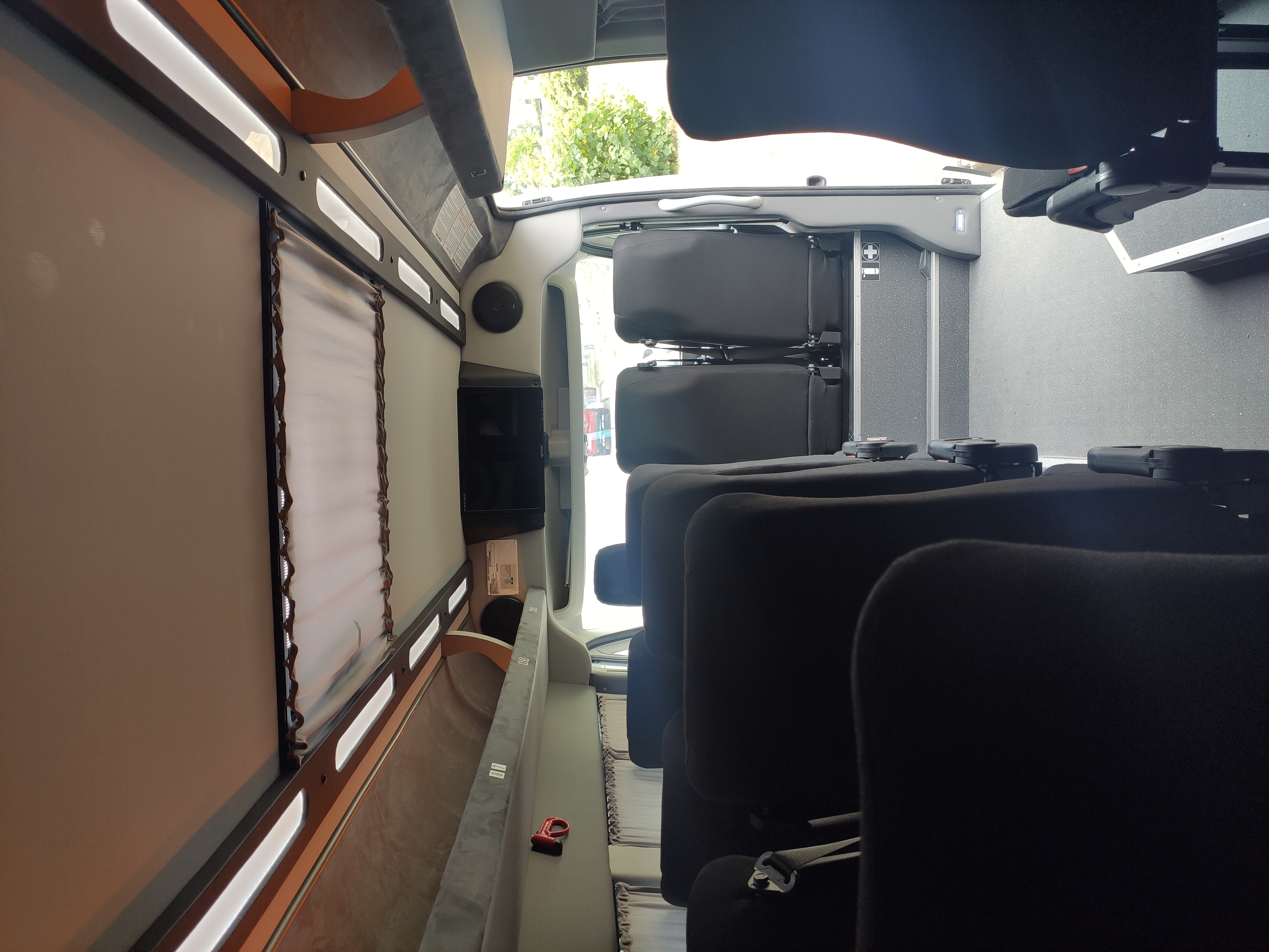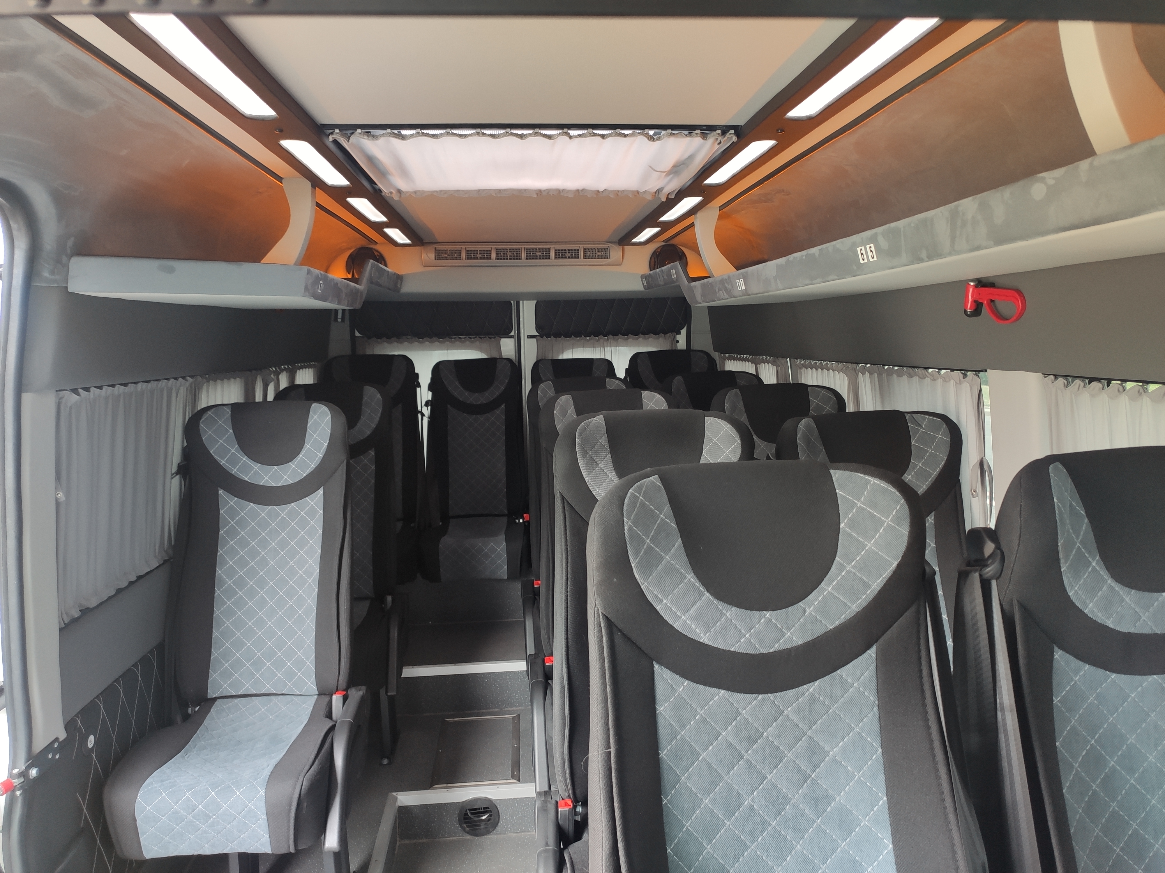 16 пассажирских мест, кондиционер, откидные сидения с ремнями безопасности, USB-зарядки, TV